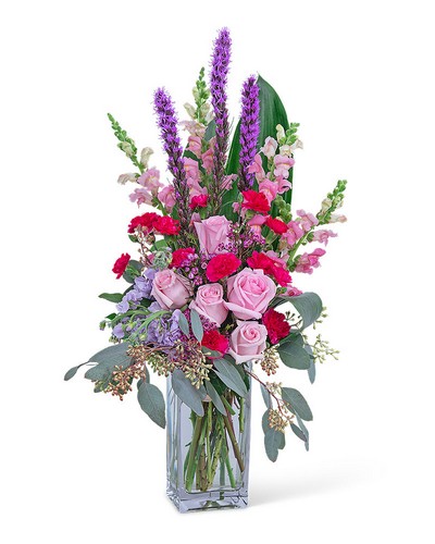 Send your love with this stunning floral design, perfect for any occasion. Sweet Expression features Pink Roses, Miniature Carnations, Liatris, Snapdragons, Stock, Wax Flower, and other premium foliage. These pink and purple flowers will brighten someone's day and make them feel extra special.