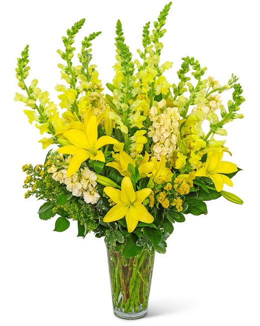 Radiant Meadow is a stunning flower design created to bring joy and vibrancy into any room! Bursting with color, this gorgeous arrangement is sure to brighten anyone's day. This beautiful bouquet features a stunning mix of yellow snapdragons, stock, lilies, solidago, and premium foliage. The combination of colors and textures in this arrangement will leave a lasting impression on anyone who receives it. Whether it's to celebrate a special occasion or simply to brighten someone's day, Radiant Meadow is the perfect choice.