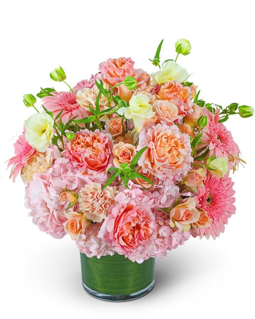 Fluttering Farewell is a captivating flower design that offers a touching tribute to a loved one. Filled with premium blooms such as roses, Gerbera daisies, carnations, and hydrangeas in soothing shades of pink and peach, this sympathy flower arrangement is expertly arranged in a leaf-lined container, conveying a message of comfort and support during a difficult time.