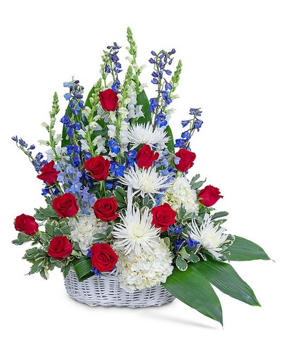 Our Freedom Tribute Basket is a popular choice for the funeral of the patriot you are honoring. Sympathy flowers for a veteran are beautifully shown in red, white, and blue funeral flowers. This patriotic theme is beautifully accomplished with Roses, Hydrangea, Snapdragons, Spider Mums, Delphinium, Aspidistra, and other premium foliage in a classic white basket.