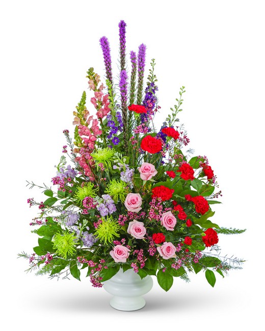Introducing our Grand Garden Urn, an enchanting arrangement that showcases the exquisite beauty of roses, carnations, snapdragons, Liatris, Larkspur, Stock, and premium foliage in a harmonious blend of light pink, dark pink, and green tones. The delicate hues of this bouquet symbolize love and hope, creating a heartfelt tribute to celebrate the remarkable journey of life. This memorial Tribute serves as a lasting reminder of cherished memories and a meaningful expression of love and admiration.