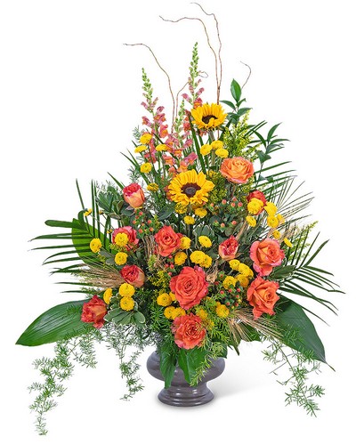 The Sunset Reflections Urn is brilliant and beautiful, featuring orange roses, snapdragons, hypericum berry, bright sunflowers, solidago, curly willow, and premium foliage. Sunflowers represent pure love and adoration, which makes this floral design the perfect accent to a funeral or celebration of life ceremony. The Sunset Reflections Urn is a radiant way to celebrate and reflect on an amazing life.