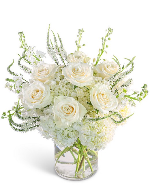 Our Chantilly Elegance design features an elegant white color palette, with White Hydrangea, Roses, Veronica, Stock, and premium foliage. This timeless arrangement exudes a sense of tranquility and sophistication, perfect for any occasion. Its serene beauty makes it a perfect choice for adding a touch of purity and grace to any space. As a trusted local florist, we take pride in every order, offering hand-crafted flower designs delivered directly to the recipient. Our flower shop is committed to providing the highest quality, freshest flowers, and ensuring timely delivery for every arrangement.