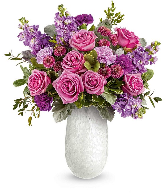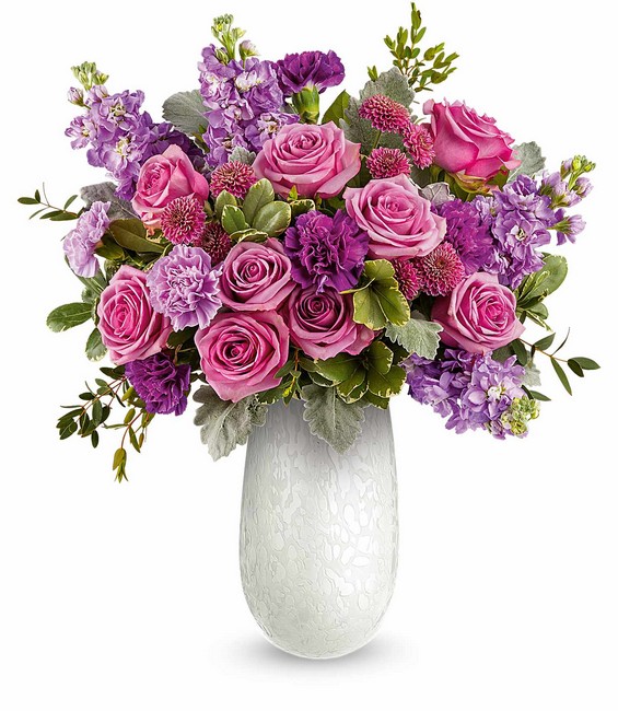 Delight Mom with the Amelia Bouquet, a graceful mix of pink and lavender blooms beautifully arranged in our Amelia Vase. This elegant art glass keepsake adds soft shimmer and a heartfelt touch to her Mother's Day.